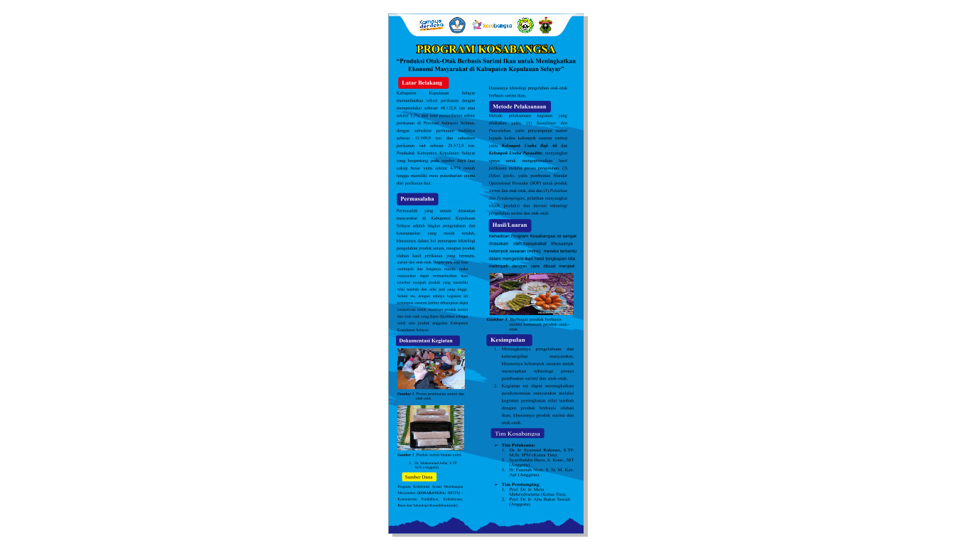 Dengan demikian, poster ini bukan hanya sekadar gambaran visual dari proyek ini, tetapi juga merupakan representasi dari komitmen bersama untuk mewujudkan perubahan positif dalam meningkatkan ekonomi masyarakat. Dengan harapan besar, proyek “Produksi Otak-Otak Berbasis Surimi Ikan” dapat menjadi tonggak penting dalam mendukung pembangunan berkelanjutan dan pemberdayaan ekonomi di Kabupaten Kepulauan Selayar.