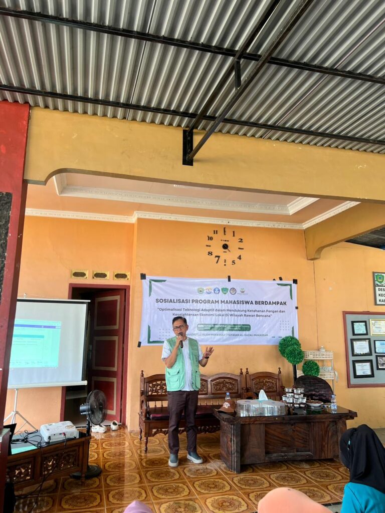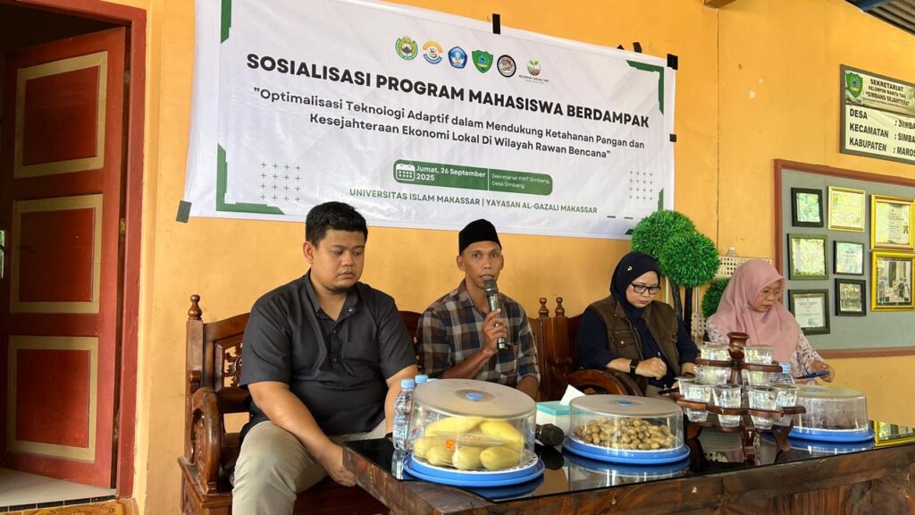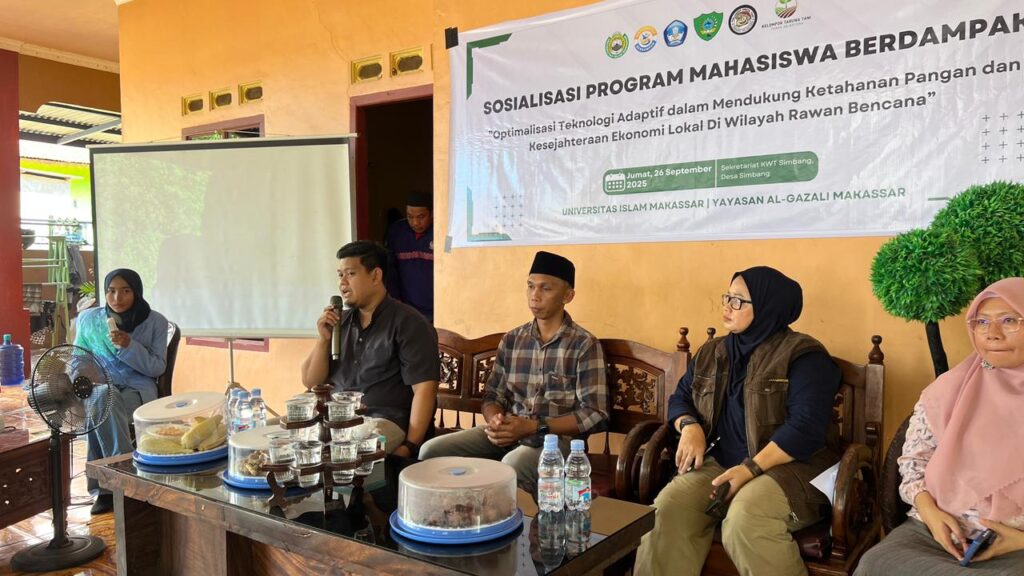 MAROS, Jumat 26 September 2025 –  Badan Eksekutif Mahasiswa (BEM) Fakultas Pertanian Universitas Islam Makassar (UIM) sukses melaksanakan kegiatan sosialisasi Program Mahasiswa Berdampak dengan tema “Optimalisasi Teknologi Adaptif dalam Mendukung Ketahanan Pangan dan Kesejahteraan Ekonomi Lokal di Wilayah Rawan Bencana”. Kegiatan ini bertempat di Sekretariat Kelompok Wanita Tani (KWT) Simbang Sejahtera, Desa Simbang, Kecamatan Simbang, Kabupaten Maros.
