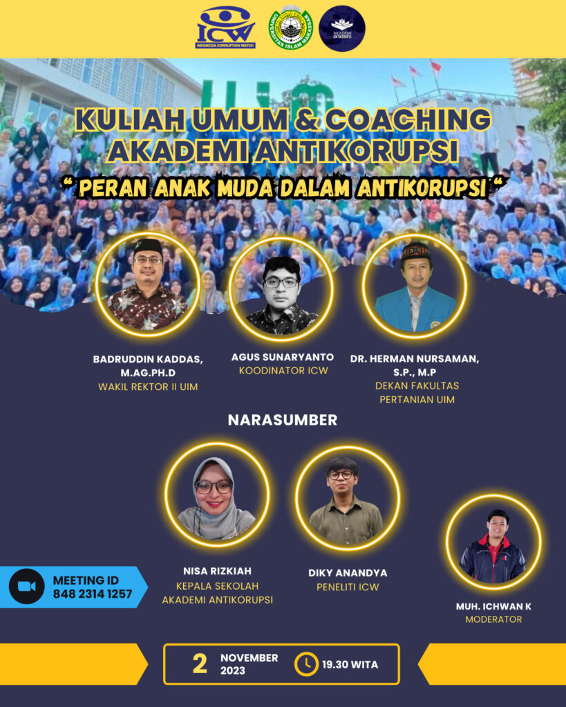 KULIAH UMUM & COACHING AKADEMI ANTIKORUPSI UNIVERSITAS ISLAM MAKASSAR “Peran Anak Muda dalam Antikorupsi” Kolaborasi Fakultas Pertanian Universitas Islam Makassar (UIM) dan Indonesia Corruption Watch (ICW) Makassar, 2 November 2023 – Fakultas Pertanian Universitas Islam Makassar (UIM) dan Indonesia Corruption Watch (ICW) bekerja sama dalam menggelar kegiatan kuliah umum dan coaching akademi antikorupsi secara online.…